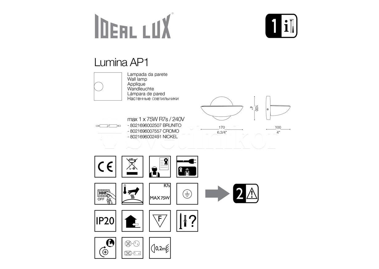 КолекціяСтильсучаснийКолір плафона (розсіювача)прозорийКолір корпусабронзовийМатеріал корпусуметалШирина, см17Глубина, см10Тип лампигалогеннаТип цоколяТип основного цоколя (патрона) який використовувуеться в цьому світильникуR7SПотужність лампи, W70Кількість ламп (джерел світла)1Лампи в комплекті (джерело світла)такКлас захистуКлас захисту 0 → світильник, який має захист у вигляді одинарного шару ізоляції. Клас захисту I → світильник, який має додатковий вивід - заземлення. Клас захисту II → світильник, в якому використовується подвійна ізоляція Клас захисту III → світильник, з максимальним класом захисту, застосовується тільки в особливо небезпечних умовах.IНапруга220-240VГарантія (міс)12- Доставка та оплата